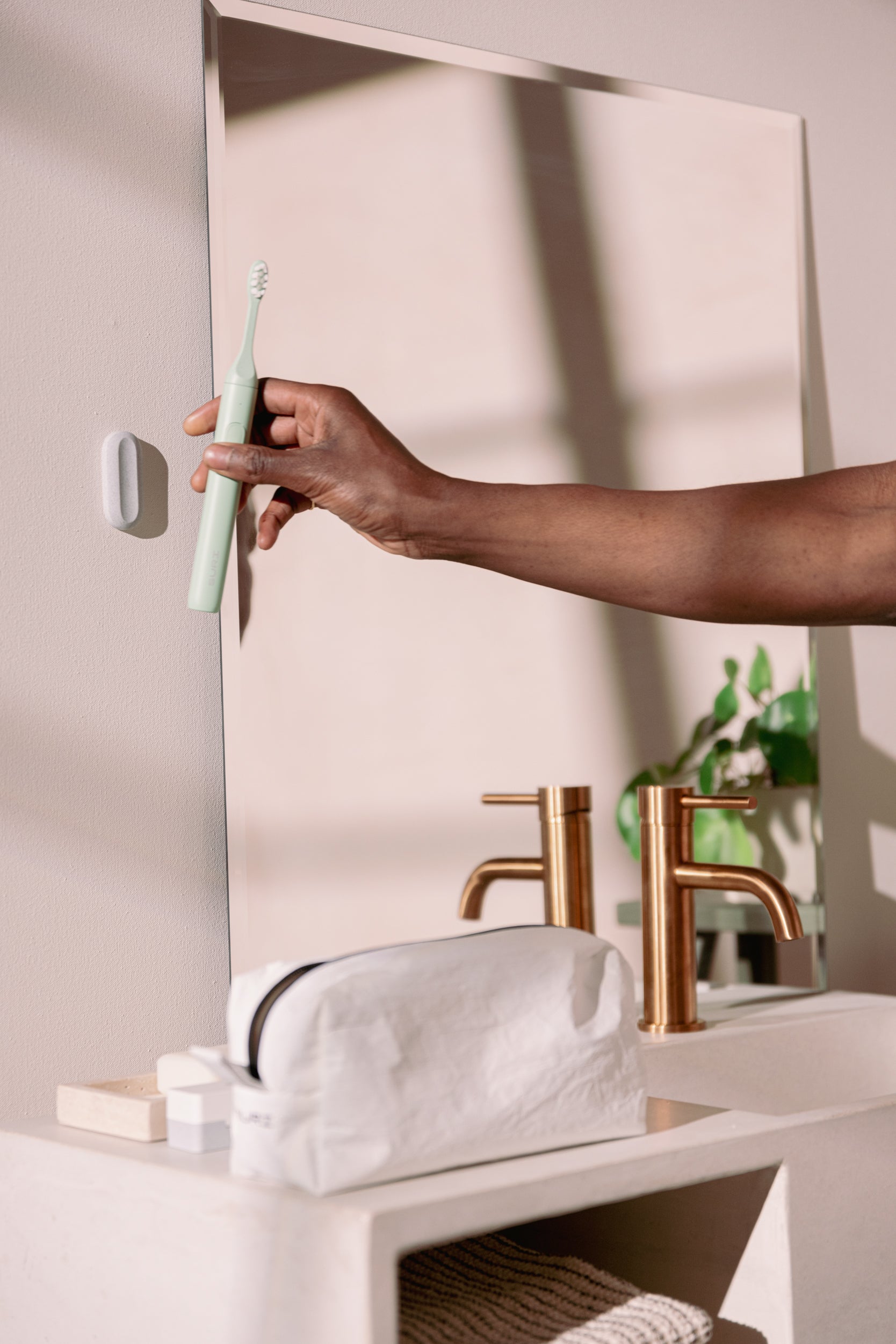 Our brush uses recyclable plant-based heads and bristles, the slim aluminium body is designed to be taken apart and repaired, all while delivering a dentist-approved clean.