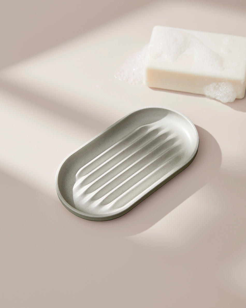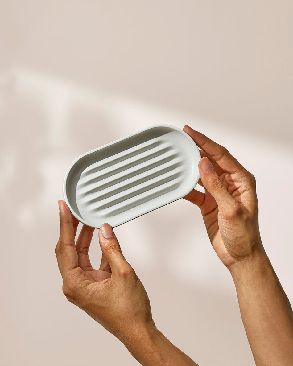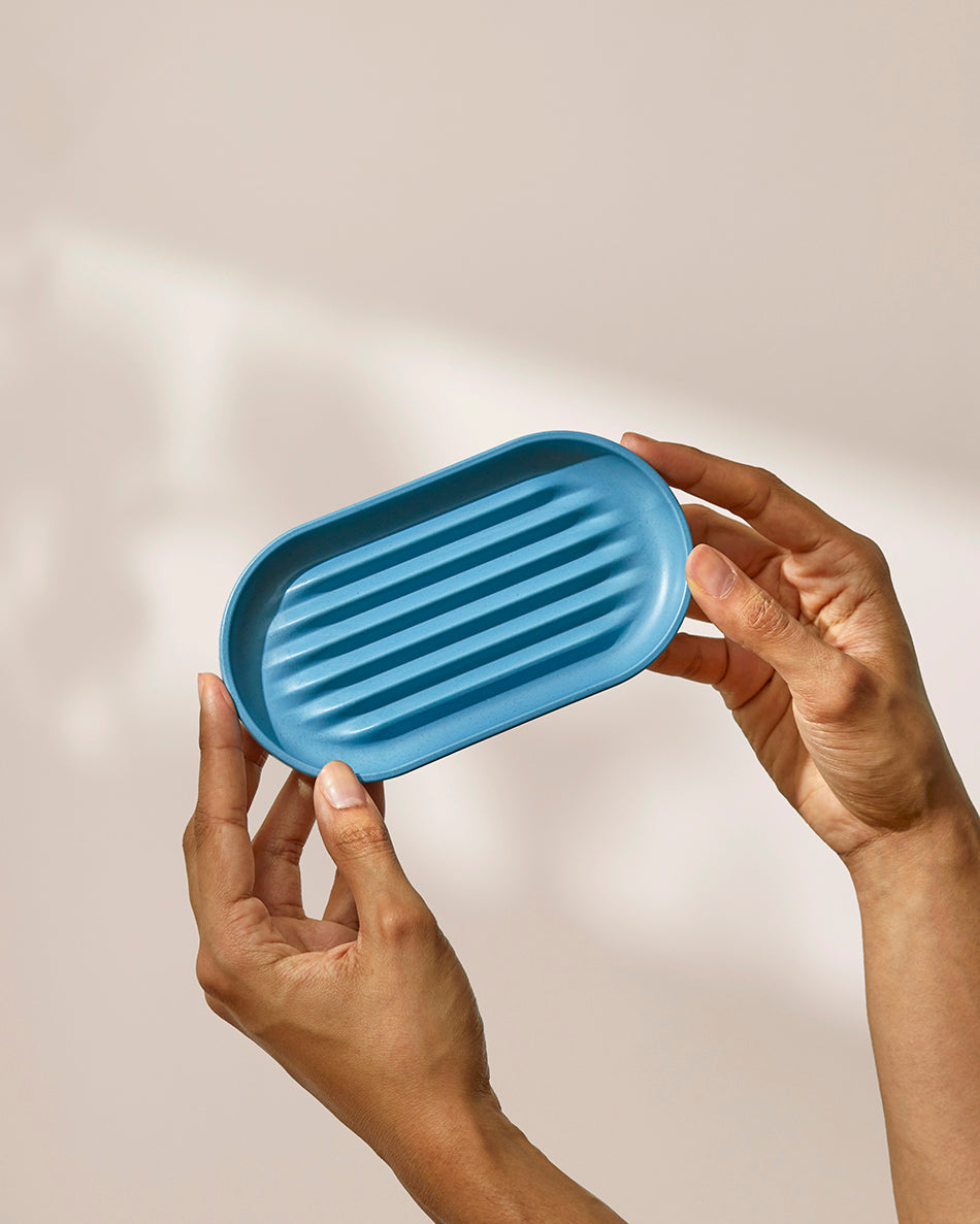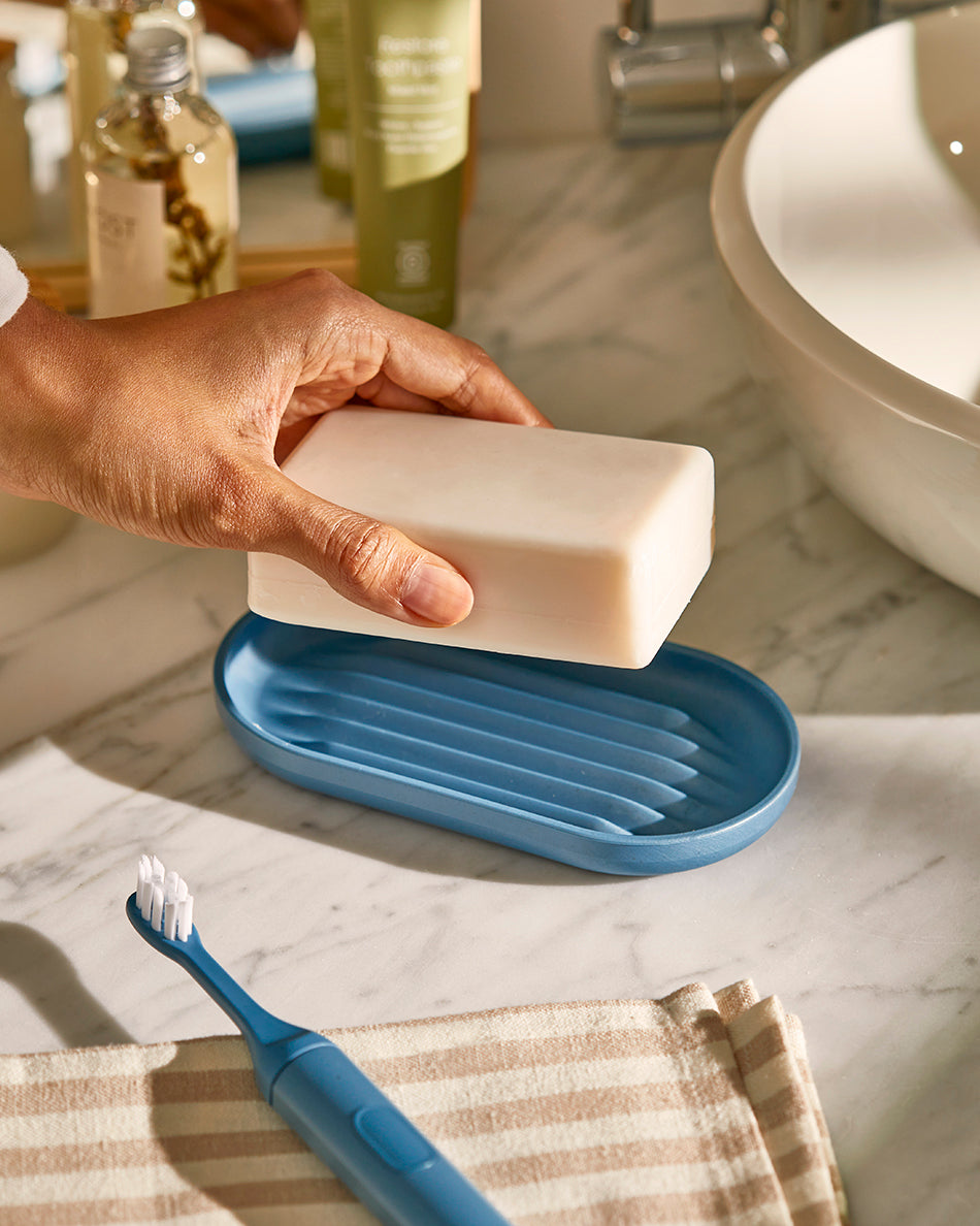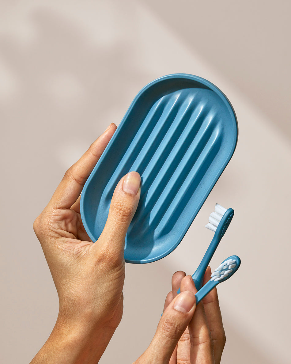 Made in the UK, each soap dish is made from eighteen returned brush heads, and due to subtle variations and natural imperfections in the material—no two dishes are exactly the same.