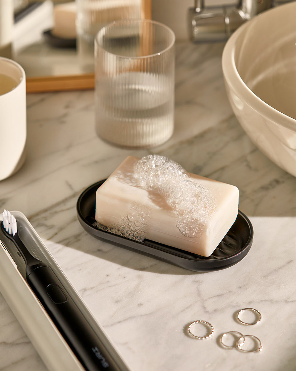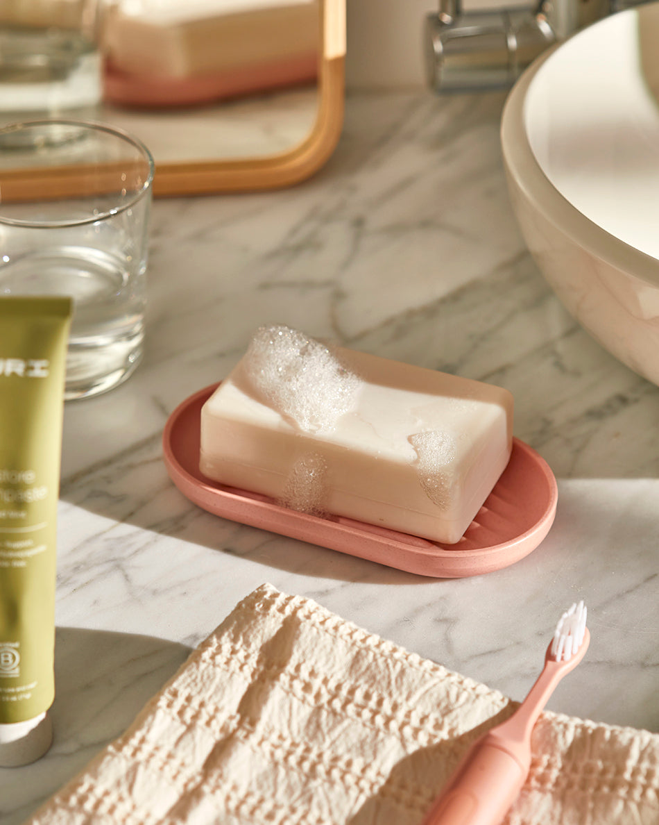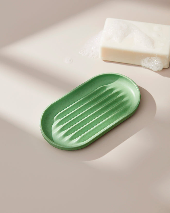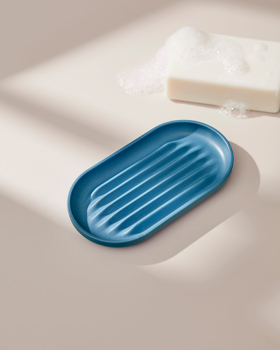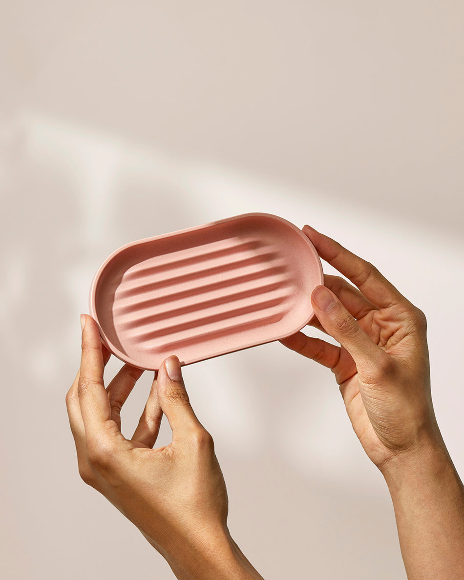 Made in the UK, each soap dish is made from eighteen returned brush heads, and due to subtle variations and natural imperfections in the material—no two dishes are exactly the same.