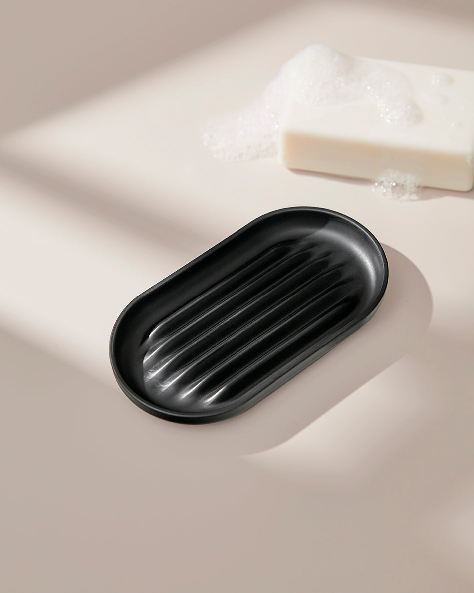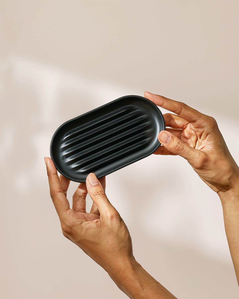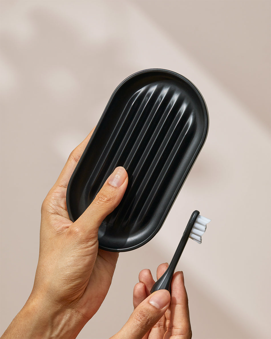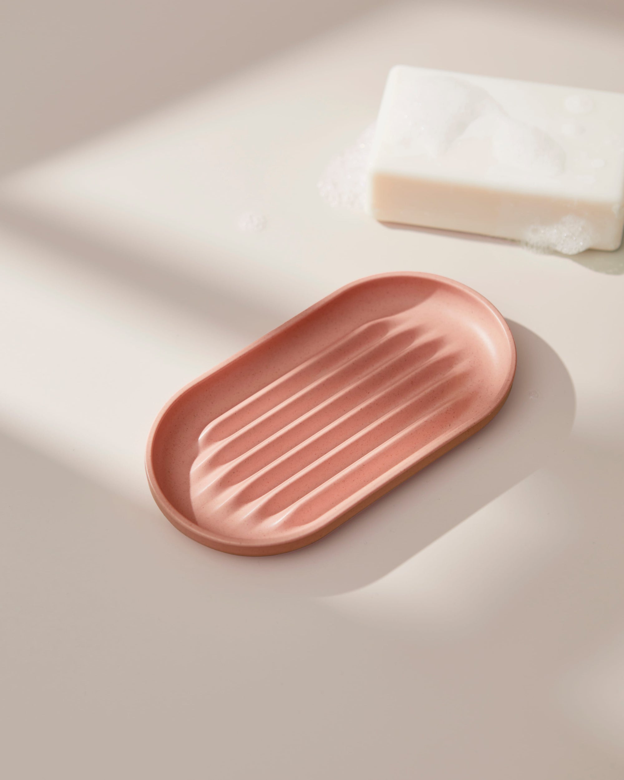Made in the UK, each soap dish is made from eighteen returned brush heads, and due to subtle variations and natural imperfections in the material—no two dishes are exactly the same.