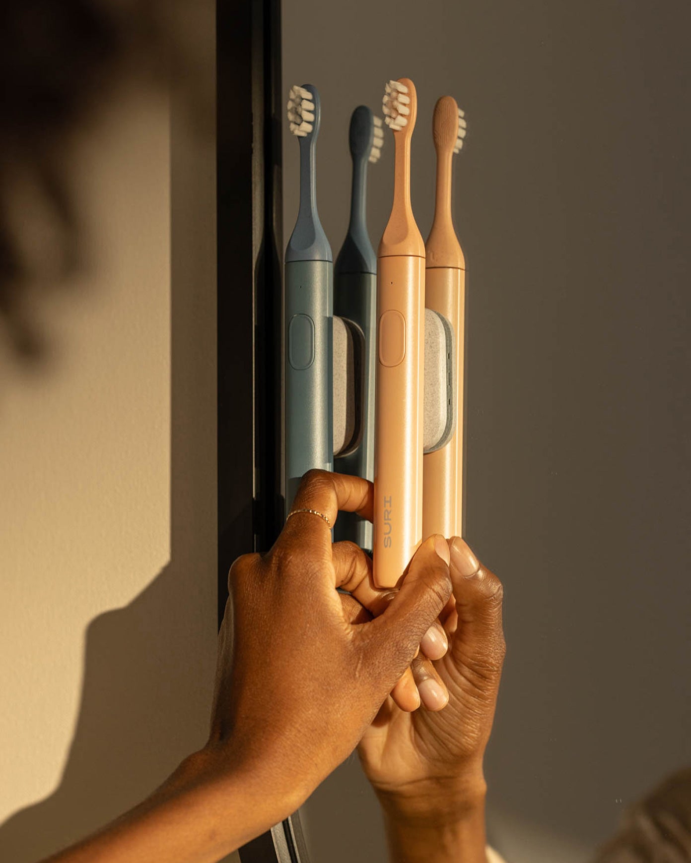 Reclaim your sink space. Easily attach your toothbrush to tiles, mirrors or walls and keep surfaces paste free.